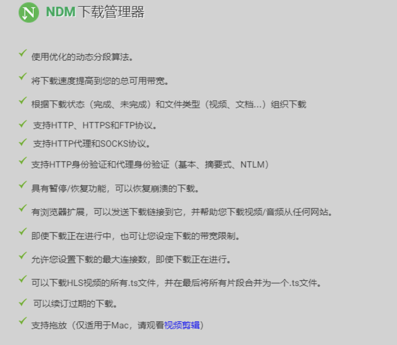 NDM是一款免费的Internet下载管理器,支持HTTP、HTTPS、FTP、HTTP代理、SOCKS协议以及HTTP身份验证和代理身份验证。